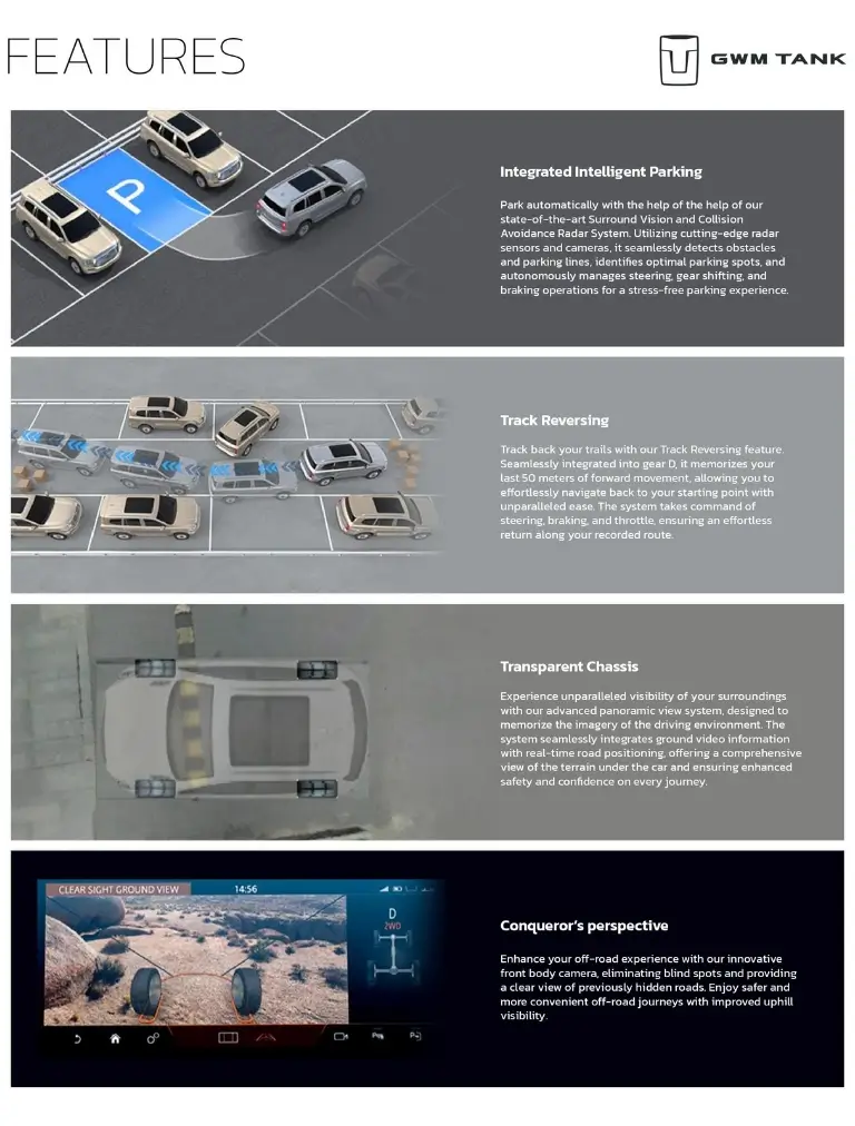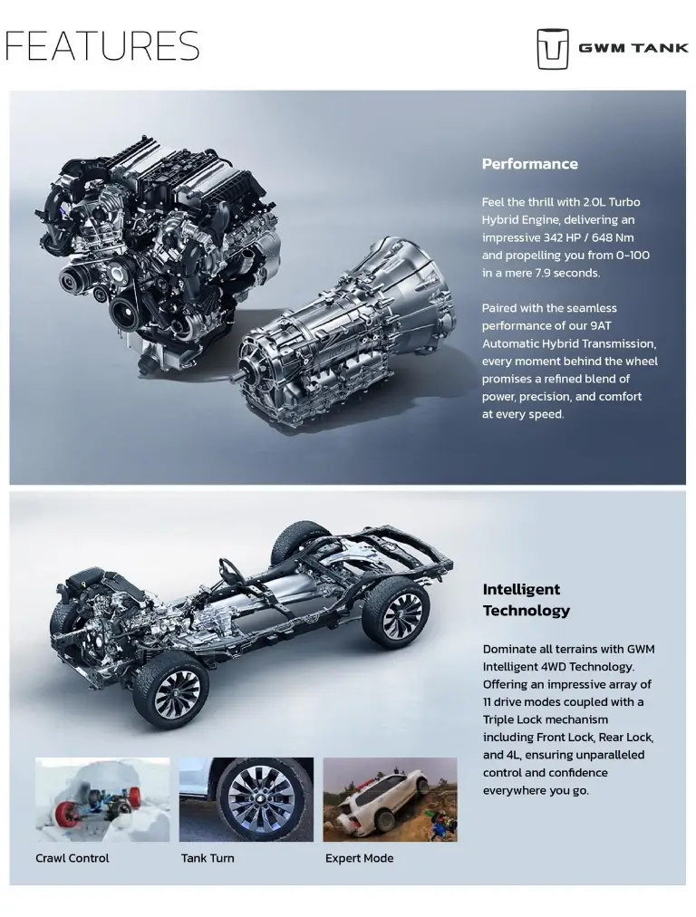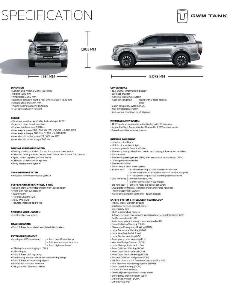 Bagi Anda yang mengutamakan daya tahan dan tenaga besar untuk medan berat, GWM Tank 500 Diesel adalah jawabannya. GWM menyematkan mesin 2.4L Turbo Diesel yang mampu menghasilkan torsi puncak hingga 480 Nm.