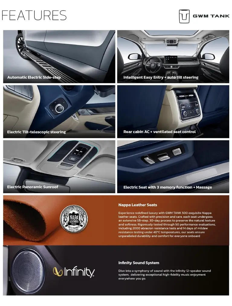 Walaupun mesin keduanya berbeda, GWM tetap menyematkan fitur mewah yang sama pada sisi interior. Anda akan menemukan jok berbahan Nappa Leather yang lembut dan memiliki fitur pijat elektrik.